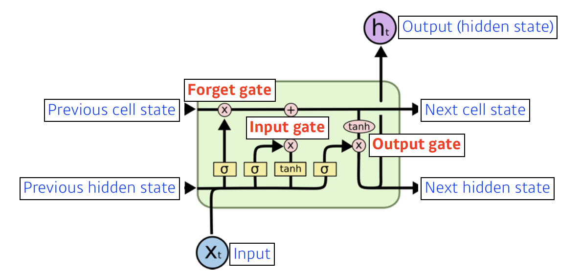 - Output Gate: 업데이트된 cell state 사용하여 출력