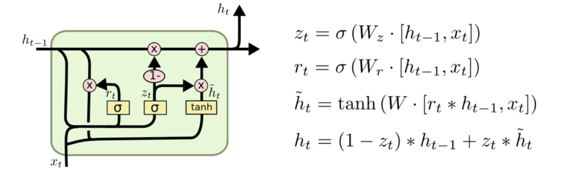 - 2개의 게이트(reset gate, update gate) -> LSTM보다 단순한 구조