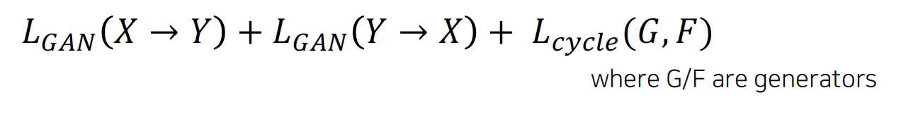 - CycleGAN loss = GAN loss (in both direction) + Cycle-consistency loss