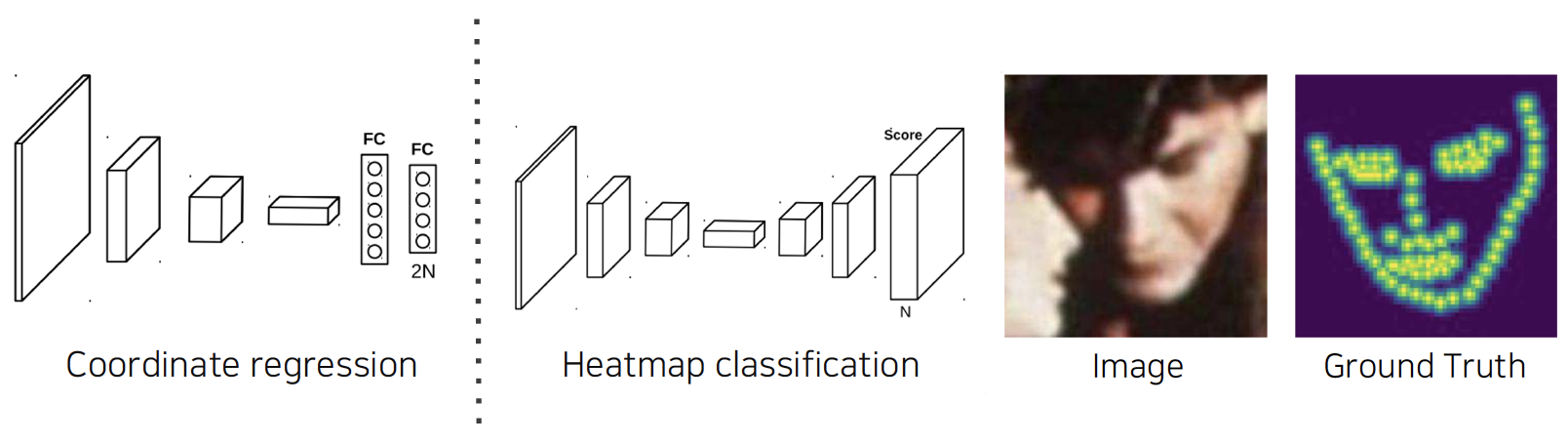 - Coordinate regression: landmark가 N개일 때 각 포인트의 x,y 위치(2N개) 예측하는 방법, inaccurate & biased