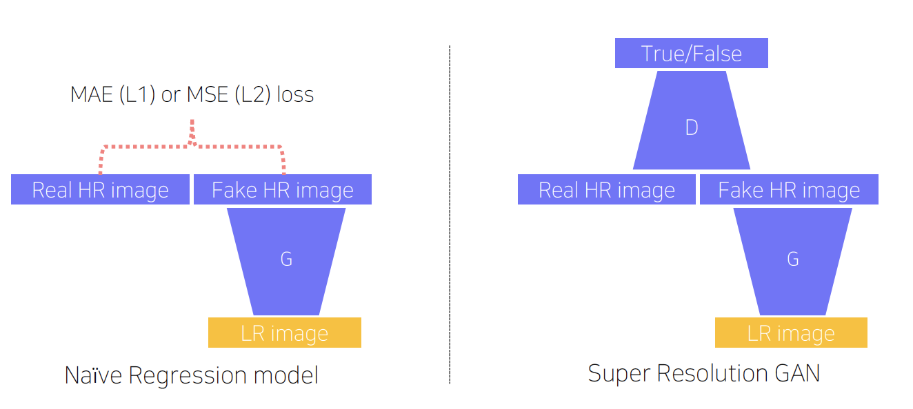 GAN loss: 검은색 또는 흰색 output 생성 - SRGAN(GAN loss for Super Resolution)