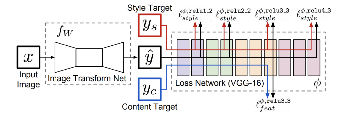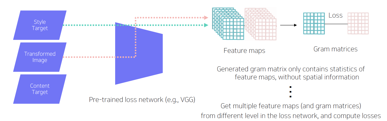 - Loss Network: style & feature loss 계산, 주로 VGG 모델 사용