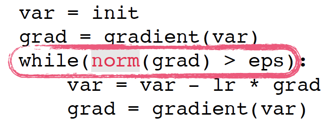 - 경사하강법 알고리즘은 그대로 적용되지만 절대값 대신 norm을 계산해서 종료조건 설정