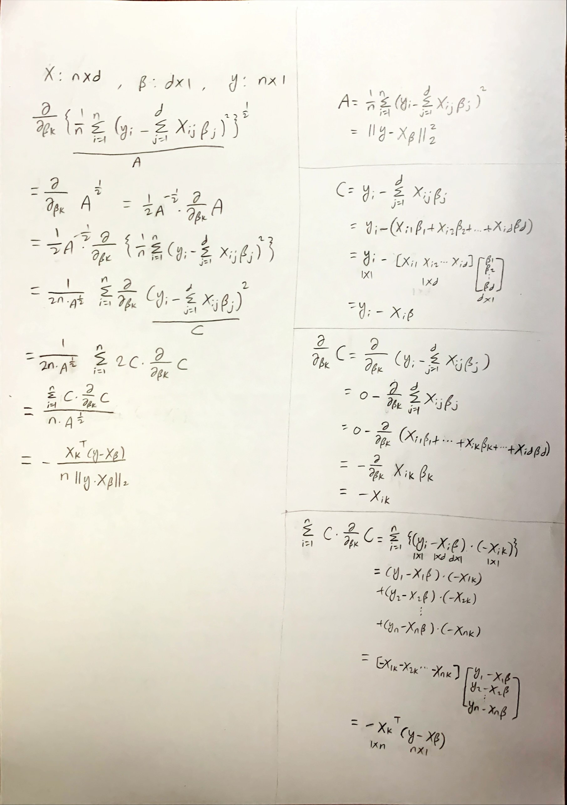 - 선형회귀의 목적식은 ||y-Xβ||2이고 이를 최소화하는 β를 찾아야 하므로 그라디언트 벡터 𝛁β||y-Xβ||2 를 구해야 함
